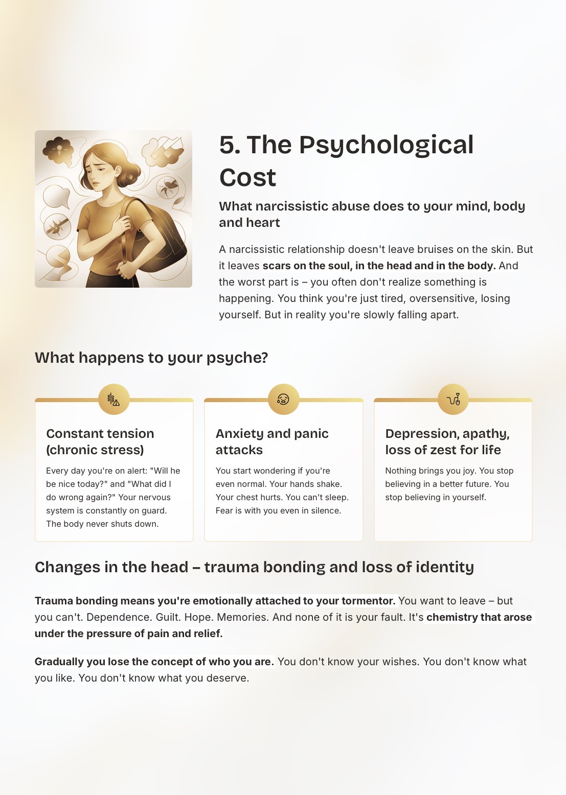 This guide helps you understand how narcissistic dynamics function, not through labels or diagnoses, but through recognizable relational patterns. It shows you what keeps these cycles going, why they are so confusing, and how self-doubt slowly replaces clarity.